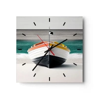 Orologio da parete - Orologio in Vetro - Una barca sulla spiaggia con un mare turchese sullo sfondo - 30x30cm - Al suo posto - Decorazione murale moderna per soggiorno e camera da letto ARTTOR