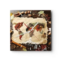 Orologio da parete - Orologio in Vetro - Una mappa del mondo fatta di spezie su uno sfondo di legno. - 30x30cm - Tutti i gusti del mondo - Decorazione murale moderna per soggiorno e camera da letto ARTTOR