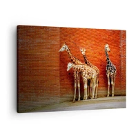 Quadro su tela - Stampe su Tela - Quattro giraffe contro un muro di mattoni in un ambiente artistico - 70x50cm - Vedete qualche acacia? - Decorazione murale moderna per soggiorno e camera da letto ARTTOR