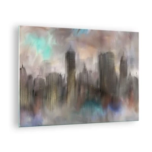 Quadro su vetro - Immagine astratta di una città con grattacieli - 70x50cm - Composizione con acciaio, pietra e nebbia - Decorazione murale moderna per soggiorno e camera da letto ARTTOR