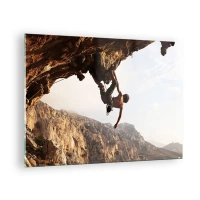 Quadro su vetro - Scalare una roccia verticale in un paesaggio montano - 70x50cm - Il mondo ristretto in una mano sul bordo del masso - Decorazione murale moderna per soggiorno e camera da letto ARTTOR