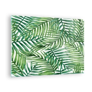 Quadro su vetro - Foglie di palma verdi su sfondo bianco che creano un motivo geometrico - 70x50cm - Sotto un baldacchino verde - Decorazione murale moderna per soggiorno e camera da letto ARTTOR