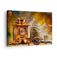 Quadro su tela - Stampe su Tela - Macinacaffè con chicchi e una tazza sullo sfondo - 70x50cm - Scricchiolio dei chicchi, tintinnio del macinino - Decorazione murale moderna per soggiorno e camera da letto ARTTOR