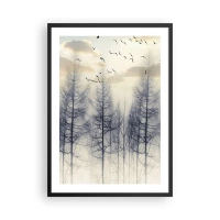 Poster in cornice nera - Una foresta nebbiosa con alberi alti e uccelli che volano al mattino - 50x70cm - Lo spirito della foresta - Decorazione murale moderna per soggiorno e camera da letto ARTTOR