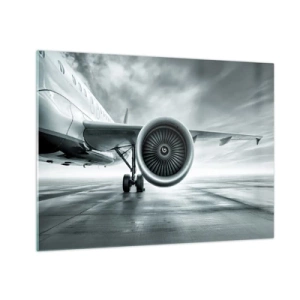 Quadro su vetro - La turbina di un aereo passeggeri sulla pista all'alba - 70x50cm - C'è la forza! - Decorazione murale moderna per soggiorno e camera da letto ARTTOR