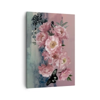 Quadro su tela - Stampe su Tela - Peonie rosa con farfalla su sfondo pastello - 50x70cm - L'apice della romanticità - Decorazione murale moderna per soggiorno e camera da letto ARTTOR
