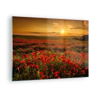 Quadro su vetro - Un campo di papaveri illuminato dai raggi del sole al tramonto - 70x50cm - Tra il fruscio delle erbe, in un'esplosione di fiori - Decorazione murale moderna per soggiorno e camera da letto ARTTOR