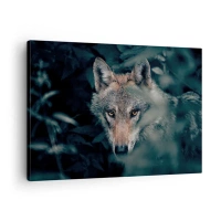 Quadro su tela - Stampe su Tela - Un lupo nel suo ambiente naturale, che osserva dalle profondità della foresta. - 70x50cm - Cacciatore - Decorazione murale moderna per soggiorno e camera da letto ARTTOR
