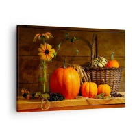 Quadro su tela - Stampe su Tela - Composizione autunnale con zucche e fiori su uno sfondo di legno - 70x50cm - Composizione rustica: i doni dell'autunno - Decorazione murale moderna per soggiorno e camera da letto ARTTOR