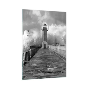 Quadro su vetro - Una foto in bianco e nero di un faro in mezzo alle onde che si infrangono. - 50x70cm - Senza paura - Decorazione murale moderna per soggiorno e camera da letto ARTTOR