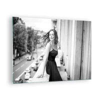 Quadro su vetro - Una donna in abito nero su un balcone in stile parigino - 70x50cm - Sicuramente parigina - Decorazione murale moderna per soggiorno e camera da letto ARTTOR