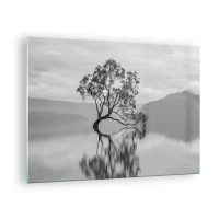 Quadro su vetro - Un albero solitario sull'acqua in un paesaggio in bianco e nero - 70x50cm - C'è un paese così - Decorazione murale moderna per soggiorno e camera da letto ARTTOR