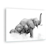 Quadro su vetro - Famiglia di elefanti bianchi e neri in natura - 70x50cm - Uno, due, tre - Decorazione murale moderna per soggiorno e camera da letto ARTTOR