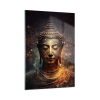 Quadro su vetro - Una figura dorata del Buddha su uno sfondo scuro con ornamenti - 50x70cm - Equilibrio spirituale - Decorazione murale moderna per soggiorno e camera da letto ARTTOR