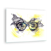 Quadro su vetro - Occhiali con motivi artistici e occhi su uno sfondo giallo - 70x50cm - Attraverso gli occhiali blu - Decorazione murale moderna per soggiorno e camera da letto ARTTOR