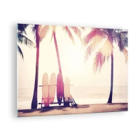 Quadro su vetro - Una vista a volo d'uccello di una spiaggia tropicale con palme e un mare turchese - 70x50cm - Vacanze in paradiso - Decorazione murale moderna per soggiorno e camera da letto ARTTOR