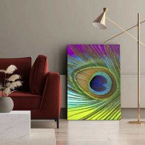 - Questo dipinto raffigura un primo piano di una piuma di pavone dai colori vivaci. Questo motivo altamente decorativo ed elegante è perfetto per interni moderni.