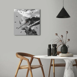 Orologio da parete - Orologio in Vetro - Una composizione in bianco e nero con la silhouette di una donna e un paesaggio montano. - 30x30cm - Ritratto montano nuvoloso - Decorazione murale moderna per soggiorno e camera da letto ARTTOR
