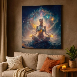 - Questa stampa su tela 70x50 cm raffigura una figura in meditazione circondata da motivi e colori energici. Perfetta per interni ispirati alla spiritualità e all'armonia.