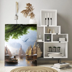 Quadro su vetro - Una suggestiva vista di un canale olandese con barche ed edifici - 50x70cm - Paesaggio urbano olandese - Decorazione murale moderna per soggiorno e camera da letto ARTTOR