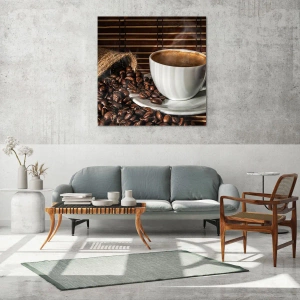 Quadro su vetro - Una tazza di caffè con chicchi su uno sfondo rustico - 70x50cm - Nero del carbone, trasparenza dell'ambra - Decorazione murale moderna per soggiorno e camera da letto ARTTOR