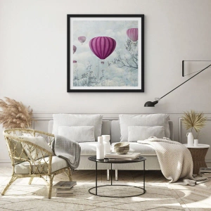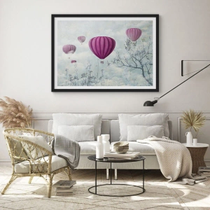 Poster in cornice nera - Palloncini viola che fluttuano sopra gli alberi tra le nuvole - 70x50cm - Come navi nel cielo - Decorazione murale moderna per soggiorno e camera da letto ARTTOR