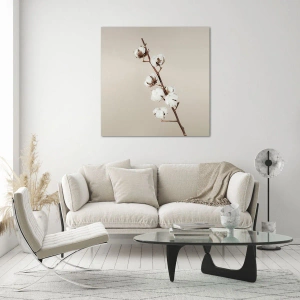 Quadro su vetro - Un rametto di cotone su uno sfondo chiaro e minimalista - 70x50cm - Alla fonte della morbidezza - Decorazione murale moderna per soggiorno e camera da letto ARTTOR