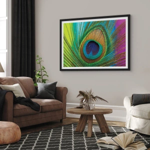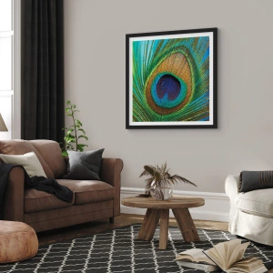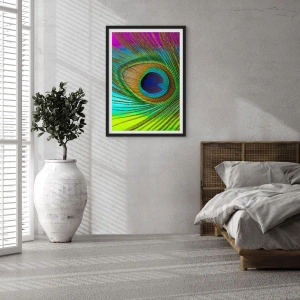 Poster in cornice nera - Particolare di una piuma di pavone dai colori intensi - 50x70cm - Occhio nell'occhio - Decorazione murale moderna per soggiorno e camera da letto ARTTOR