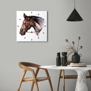 - Questo orologio da parete 30x30 cm, realizzato in vetro resistente, presenta un ritratto di cavallo in stile artistico su uno sfondo chiaro. Perfetto per interni eleganti e minimalisti.