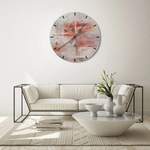 - Questo orologio da parete artistico da 30x30 cm presenta una composizione astratta di pennellate nei toni del rosa e del bianco. Realizzato in vetro, è rotondo e perfetto per interni moderni, pastello e artistici.