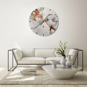 - Un orologio rotondo in vetro da 30x30 cm con una rappresentazione artistica di soffici fiori di cotone bianchi su uno sfondo chiaro, perfetto per interni minimalisti e scandinavi.