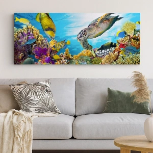 Quadro murale - Passeggiata Corallo - Mondo sottomarino con pesci colorati e una tartaruga tra i coralli