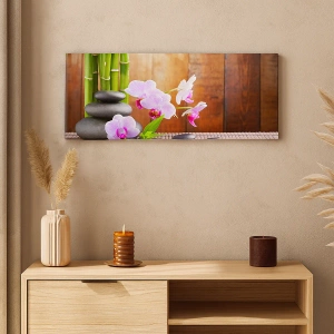 Quadro su tela - Stampe su Tela - Bambù in stile zen, pietre e orchidee rosa su uno sfondo di legno - 50x70cm - Scopri i piaceri dell'oriente - Decorazione murale moderna per soggiorno e camera da letto ARTTOR