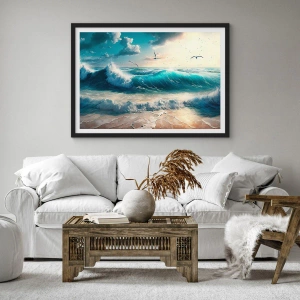 - Il poster raffigura onde turchesi che si infrangono su una spiaggia dorata. La composizione dinamica, unita a un'illuminazione soffusa, conferisce all'immagine un'atmosfera armoniosa ed estiva, perfetta per interni tranquilli.