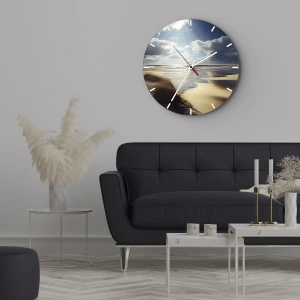 L'orologio da parete ""Spiaggia, spiaggia selvaggia"" presenta un pittoresco paesaggio di una spiaggia selvaggia. Dune, sabbia fine e una superficie del mare calma si armonizzano con un cielo pieno di nuvole spettacolari attraverso le quali penetrano i raggi del sole. La composizione catturata nell'ora d'oro riflette la bellezza dello spazio marino.