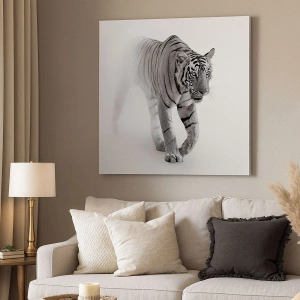 - Il dipinto raffigura una maestosa tigre che emerge dalla nebbia, nei delicati toni del bianco e nero. È l'aggiunta perfetta agli interni che celebrano la natura selvaggia ed elegante.