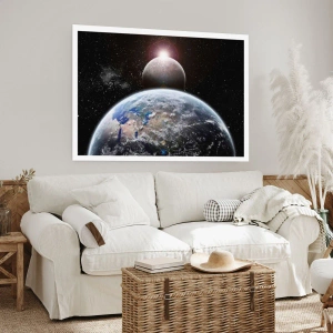 Poster - Il pianeta Terra e la Luna sullo sfondo dello spazio stellato. - 100x70cm - Paesaggio cosmico: sorgere del sole - Decorazione murale moderna per soggiorno e camera da letto ARTTOR