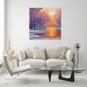 Quadro su vetro - Paesaggio invernale con un ponte e alberi innevati al tramonto - 70x50cm - Incontriamoci qui - Decorazione murale moderna per soggiorno e camera da letto ARTTOR