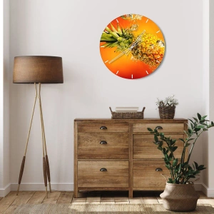 Orologio da parete - Orologio in Vetro - Un ananas immerso nell'acqua su uno sfondo sfumato arancione. - 30x30cm - Succosa freschezza tropicale - Decorazione murale moderna per soggiorno, cucina e camera da letto ARTTOR