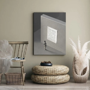 - Un dipinto minimalista che raffigura una figura in un labirinto che osserva una mappa appesa. Il simbolismo del perdersi e della ricerca di una via d'uscita dona riflessione e armonia all'ambiente. Perfetto per interni moderni.