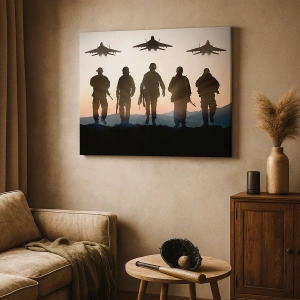 - Un dipinto che raffigura le sagome di soldati e aerei da combattimento sullo sfondo di un tramonto. Una composizione carica di forza e determinazione, perfetta per interni moderni e in stile militare.