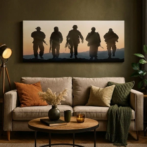 Il dinamismo di questa composizione cattura perfettamente il carattere dei soldati e la loro determinazione di fronte alle sfide. I caccia in volo aggiungono un tocco moderno all'immagine, integrandosi perfettamente negli stili militari e contemporanei. Quest'opera d'arte unica ispira e motiva, rendendola la scelta ideale per interni che enfatizzano forza e coraggio.