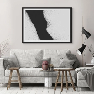 - Il poster "Liquid Balance" presenta un design minimalista a onde in nero e grigio a contrasto. Il suo sorprendente effetto granuloso e la semplicità geometrica donano eleganza e modernità a qualsiasi interno.