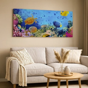 Quadro su tela - Stampe su Tela - Barriera corallina con pesci colorati e una tartaruga marina - 140x50cm - Ma cosa sappiamo della vita... - Decorazione murale moderna per soggiorno e camera da letto ARTTOR