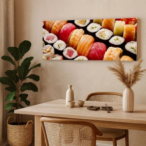 Quadro su tela - Stampe su Tela - Sushi colorati disposti in file con vari condimenti - 50x70cm - Colori e sapori dell'Asia - Decorazione murale moderna per soggiorno e camera da letto ARTTOR
