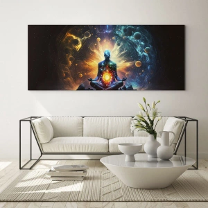 Quadro su vetro - Una silhouette in meditazione in un'esplosione cosmica di colori - 120x80cm - Pace cosmica - Decorazione murale moderna per soggiorno e camera da letto ARTTOR