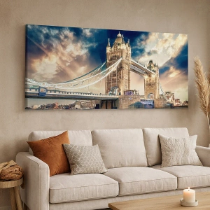 - Il dipinto raffigura il Tower Bridge di Londra, circondato dalle luci del tramonto e da un cielo dinamico. Simbolo della città in tutto il suo splendore, è perfetto come elemento decorativo in interni eleganti.