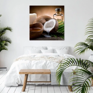 Questo dipinto è un'ottima scelta per chi apprezza le decorazioni ispirate alla natura e a uno stile di vita sano. Elementi come cocco, olio e candela creano una composizione armoniosa che porta freschezza e calore agli interni. Si adatta perfettamente ad interni in stile tropicale, minimalista o spa.