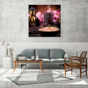 Quadro su vetro - Composizione rilassante con Buddha, candele e fiori - 50x70cm - Purificare la mente, calmare il corpo - Decorazione murale moderna per soggiorno e camera da letto ARTTOR