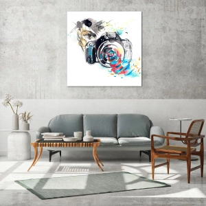 "Nell'occhio dell'obiettivo" è un moderno quadro su vetro che raffigura una macchina fotografica circondata da elementi astratti e colorati. Questa composizione artistica, ricca di dinamismo e creatività, affascina per la sua chiarezza e originalità. È la decorazione perfetta per chi ama la fotografia e l'arte contemporanea.
